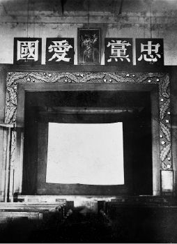 图五 一位国民党军队的少尉收藏过的照片。礼堂正中的标语“忠党爱国”表达了国民党对官兵的一般政治规范,而其中的蒋介石标准像,明显后来被涂抹过。