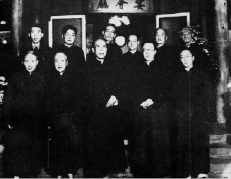 图四 1948年10月23日,常风与友人在北平的合影。前排右起:李长之、梁实秋、杨振声、俞平伯、朱光潜;后排右起:善秉仁司铎、章川岛、沈从文、常风、冯至、赵先生(怀仁学会职员)。