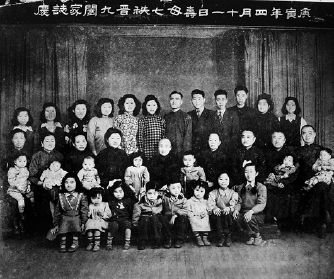 1950年,刚从战乱中建立起来的中华人民共和国面临的是严重的物资匮乏。但这个家庭成员的穿着打扮以当今的标准似乎仍可以组成一支毫不逊色的时装表演队。这家人中第一代和第二代虽穿着传统的长袍、旗袍或大襟衣服,但男士脚下闪亮的革履和女士的绣花鞋仍显露着他们的高贵。后排虽有一人仍穿长衫,但时尚的西装和挺括的中山装把其余三个小伙子装扮得挺拔英俊。女士们旗袍的料子是鲜艳入时的,而毛衣作为外套穿戴在今天也是一种时尚,三个小姑娘大翻领的学生装洋溢着朝气。女士们和男士们的发式都经过电热风和油脂发蜡的精心处理,那种大波浪的发型也在改革开放后的七十年代底和八十年代初的女士们头上开始重现。前排那些娃娃们五彩缤纷、形式各异的童装,在今天仍不能说已经落伍。