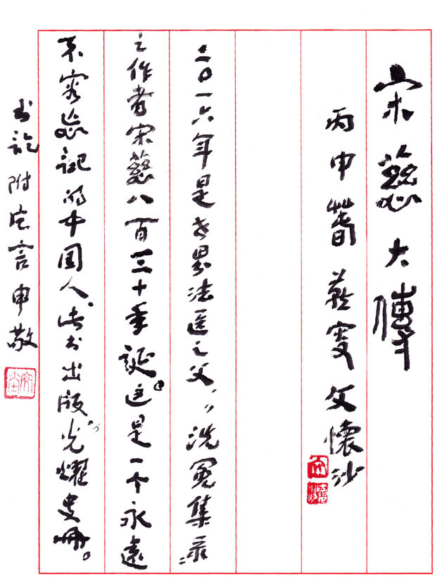 一九八六年纪念宋慈诞生八百周年时征集画作,我选了著名画家张自生的这张印作纪念册封面。画中宋慈侧身低头沉思,身后的手里拿着一只笔,笔尖有一点红墨,宋慈没穿官服,穿普通衣衫,这似乎是下班后的样子,下班后他还在思考什么?写《洗冤集录》吗?可为什么用红笔?写书该用黑墨呀?这该是斟酌判决问题。“反复深思,唯恐率然而行死者虚被涝漉”(宋慈语)。这里的“死者”已不是无罪的百姓,而是要判决的罪犯,他在反复深思,是不是完全没有疑问了,量刑准不准,万一杀错,死不复生。他是个以民命为重,对犯人也有大悲悯的大法官。我至今没有跟张自生先生交流过这幅画,不知他创作这幅画是怎么想的,但我感到,双手背在身后拿着的那只红笔有千钧重量,下班后依然这样低头深思(而不是昂首向前),生恐自己有错而使罪犯蒙受冤屈……这样的大法官,在中世纪的欧洲各国都没有。这样的法官形象不是范仲淹、不是司马光、不是欧阳修,也不是朱熹……这就是宋慈!