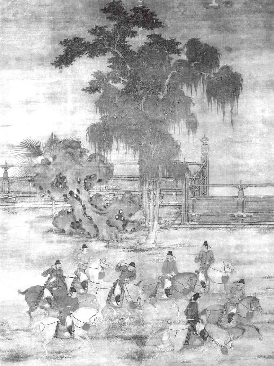 在这清明时节的汴京郊外,最美的春色不是怒放的山花,是那些春游的少女。“三月三日天气新,长安水边多丽人”,汴京的青楼女子可不想辜负这春色,骑着毛驴、披着凉衫到山野中访春。一群年少的风流子弟,骑着骏马,轻衫小帽,跟在丽人后面,追逐春光。还有几个文身的恶少年,“用短缰促马头刺地而行”,“呵喝驰骤,竞逞骏逸”,大概是想以此吸引佳人的注意吧,就如今日开着宝马飙车的“古惑仔”,寻求速度的刺激、观者的惊呼。