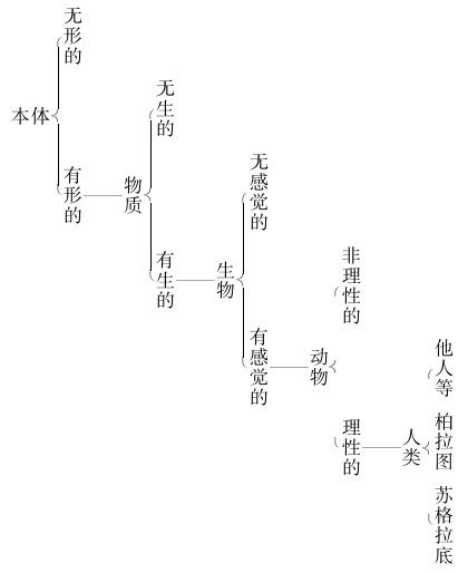 苏格拉底此西洋古代逻辑家朴尔斐利所制,以说明类与种之关系者也。以荀子术语说之,则此中“本体”为最大之共名,其上“至于无共”。“人类”为最小之别名,其下“至于无别”。至于“物质”、“生物”、“动物”等,则对于在其上者为别名,对于在其下者为共名也。