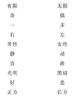 【注】所谓象数之学,初视之似为一大堆迷信,然其用意,亦在于对于宇宙及其中各方面之事物,作一有系统的解释。其注重“数”、“象”,与希腊之毕达哥拉学派,极多相同之点,兹略述毕达哥拉学派,以资比较。亚里士多德曰:“这些哲学家(毕达哥拉学派之哲学家)显然以数目为第一原理,为生存的物之质因(Material cause),且为其改变与永久形状之形式。数目之原质即奇偶:奇为有限;偶为无限。他们以为“一”自此二者出。(因“一”亦奇亦偶)从一生出一切数目;全宇宙都是数目。此派之别的哲学家说有十原理;他们列之为平行的两行: