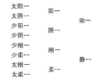 太刚,太柔,少刚,少柔,如何生出,此未明言。依康节之逻辑推之,则“动”与“阳”与“刚”之象皆为―;“静”与“阴”与“柔”之象皆为--。合第二层与第一层观之,则见动方面动中有静。故第三层之属于“动”方面者,可以有“静之大者”之“太阴”与“静之小者”之“少阴”。依同理则静方面亦静中有动。对此方面亦可曰:动之大者谓之太刚;动之小者谓之少刚。静之大者谓之太柔;静之小者谓之少柔。