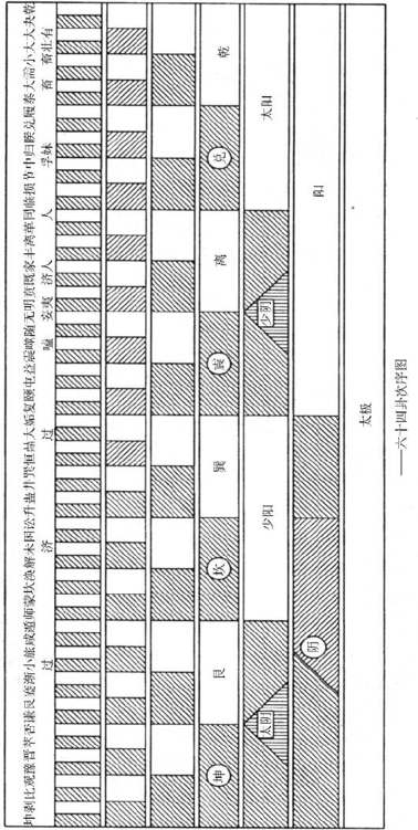 “一分为二,二分为四,四分为八。八分为十六,十六分为六十四。”此数也。一至八之数所生之象,即上图所表示。八至六十四所生之象,若以图表示之,即为六十四卦次序之图;其图(《宋元学案》引)如下: