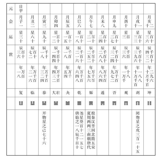 朱子谓邵子《皇极经世》说“天开于子,地辟于丑,人生于寅”。元以甲乙丙丁计,会以子丑寅卯计,辰仍以甲乙丙丁计。现姑以现在之一元为元甲,此元之第一会即月子,此会有三十运,三百六十世(每运十二世,三十乘十二得三百六十世)一万〇八百年。(每世三十年,三十乘三百六十得一万〇八百年)此时一阳初起,如复卦