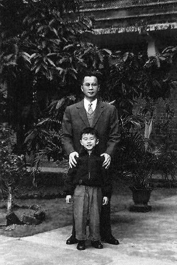 【图:】父子两人就睡在那无法转身的小房间里。灯一灭,香港俱乐部大厅水晶灯那华丽的光,就从门缝里泻进来一条线。(林百里和父亲)】
