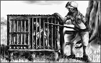 还有一次,有一个苏格兰俘虏拒绝签“绝不逃亡”的切结书,他被双手反绑,捆在一棵树干上,日本兵绕到那树后面用枪托猛敲树干然后就快速让开,一瞬之间,一阵密密麻麻的红蚁从树洞倾巢而出,扑向那绑在树上的俘虏。他以同一个姿势被绑在那儿三、四天之久,大便都流在自己身上。丹尼士不知道他是否幸存。