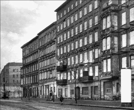 (街道在西方, 楼房属于东方。楼房上的窗口就是著名的“死窗户”,被砌死以阻止人们逃到西柏林)