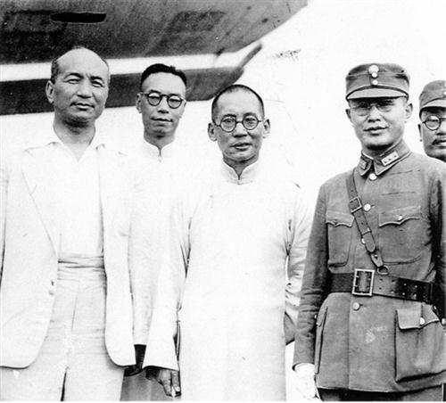 一九三八年十二月,龙云(右二)、周佛海(左二)到昆明机场迎接汪精卫、褚民谊(左一)等,协助汪精卫一行逃往河内