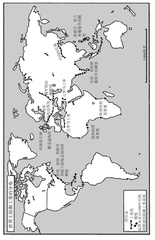 可以肯定,几乎在任何地方,只要建立起了中央权威,就必然会建造战略防御。其中有简单的,如把盎格鲁-撒克逊人居住的英格兰和凯尔特人居住的威尔士分隔开来的奥法堤,不过在它那个时代,它一定是一项浩大的举措,为挖土而耗费的人工日不下好几万个;也有像中国的长城那样时至今日仍然神秘未解的复杂工程。较难确定的是这些防御的具体职能,因为它们的职能各不相同,无法笼而统之。哈布斯堡帝国和奥斯曼帝国接壤处的军事防线(krajina)肯定是为了阻隔土耳其人的,但建造这样的防线意味着土耳其的力量强于奥地利,虽然哈布斯堡帝国的历史更加久远。相比之下,18世纪60年代为保护不列颠南部和东部海岸的港口而花费巨资修建的一连串碉堡(到1867年,有76座碉堡完成或在建)是对法国威胁这一幽灵的反应,可能它证明了英国人本能地对铁甲舰艇不放心,不相信它们能提供有效防卫,而他们对木头墙这方面的能力倒一直深信不疑。路易十四沿法国东部边界建起的碉堡链是侵略用的工具,借以一步步地把法国的力量延伸到哈布斯堡的土地上;俄国的沙皇从16世纪开始逐渐向东部大草原纵深修建的一连串由临时性碉堡组成的碉堡线(cherta)更是如此。沙皇此举是为了把大草原上的游牧民族挤到乌拉尔山以南,为俄国人开辟一条去西伯利亚定居的通道。然而,要延长碉堡线,必须有哥萨克人的帮助;哥萨克人尽管不太热心,但还是提供了帮助,可他们没有意识到,碉堡线的一个职能就是把他们的自由居住区纳入莫斯科的控制之下。