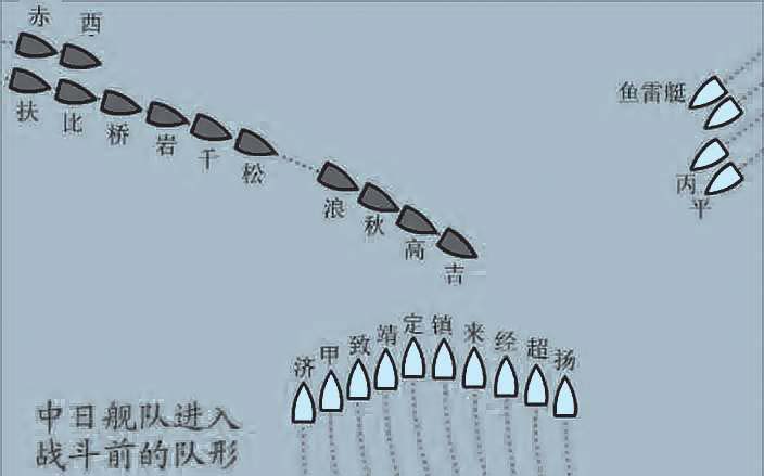 后世的一大争论,是在两支舰队遭遇时,丁汝昌下令北洋舰队排成“雁行阵”冲向日本联合舰队,而日本联合舰队则采取纵队回应。由于北洋舰队的阵型只能发挥舰首炮的威力,而日本联合舰队则可以发挥侧舷炮数量多的优势,所以最终北洋舰队落败。