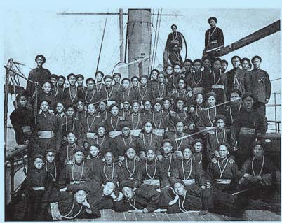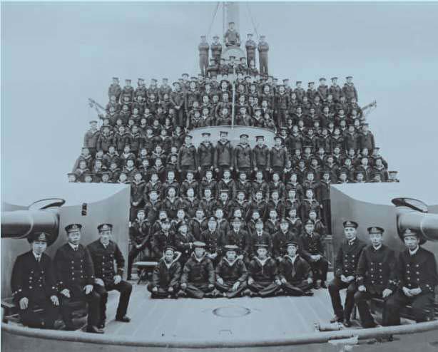 左图为甲午战争时期“致远”舰的全体官兵合影,右图为“海琛”号上全体官兵合影——此时的大清水师已经全部着英式服装,进行英式操练