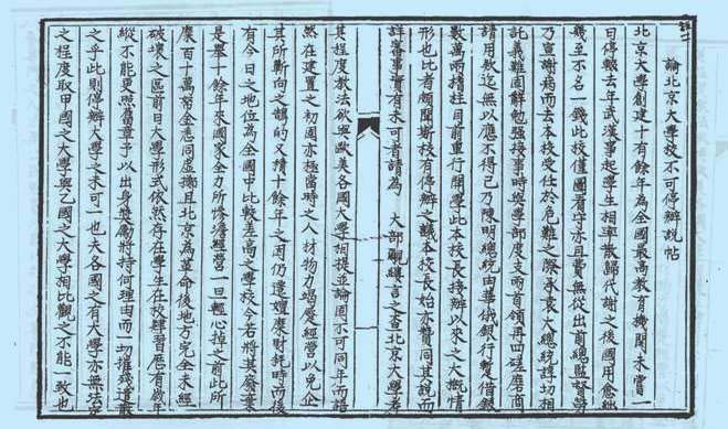 后民国当局曾一度下令停办北京大学,严复四处奔走,并亲笔上书《论北京大学校不可停办说帖》,自己又跑到比利时银行借贷20万元,才使得北京大学得以继续办学