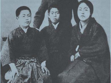 1893年,9岁的高野五十六(中)与五哥高野季八(左)和大他18岁的姐姐高野(高桥)嘉寿子(右)合影