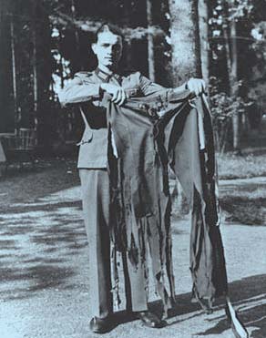 一名士兵展示阿道夫·希特勒在炸弹行刺中被烧坏的裤子