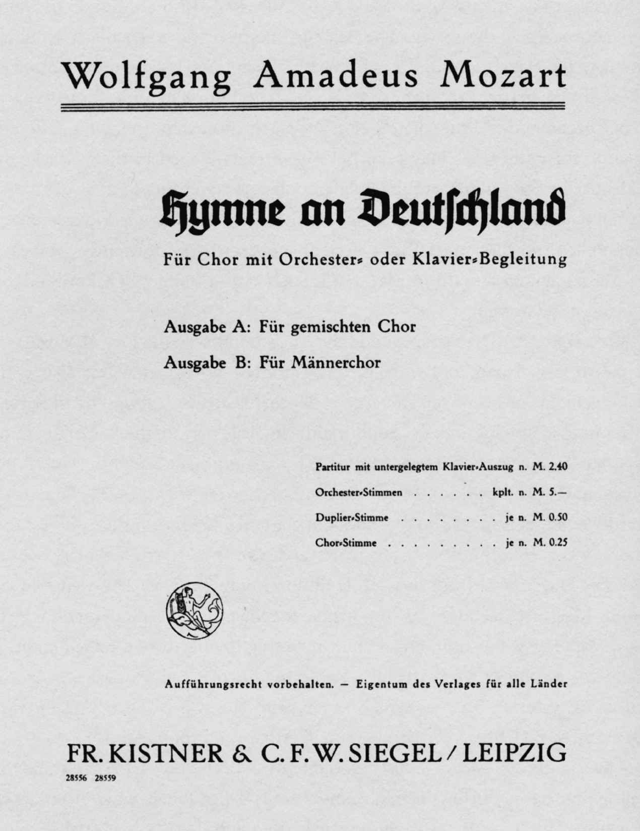 《德国颂》无疑反映了第三帝国最初几个月中音乐出版界的一股特殊潮流,当时的市场特别能容纳颂扬民族革命的作品。[71]在这一时期印行一首莫扎特创作的爱国颂歌,也可能是针对奥地利的宣传运动所激发的动作。此曲出版一个月后,奥地利查禁了纳粹党,德国人的反击则是不让德国艺术家参与即将到来的萨尔茨堡音乐节。[72]