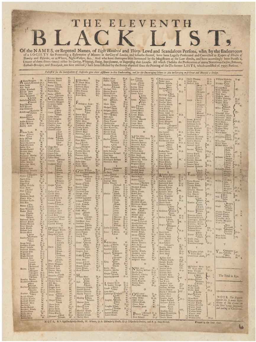 到1700年,在首都已经有超过一打的各类团体投身于控诉恶行。尽管如此,最初位于伦敦塔桥的社团脱颖而出,领导了反对卖淫的运动,并通过自身的扩张重组,成为了覆盖全市的组织,侦查“色情场所与其中经常出没之人,以将其绳之以法”。也是这一社团,首先发表了一份年鉴,介绍其成就。从1694年到1707年,这个社团每年都会制作一份“黑名册”或“黑名单”,其中以字母顺序列出过去十二个月中接受审判的性罪犯之姓名与罪行,直到这份名单越来越长,他们才不得不罢休。这些名单被印刷出数千份,广泛散布与张贴,警告那些犯罪者,鼓舞那些同道者,其影响已远及于首都之外。