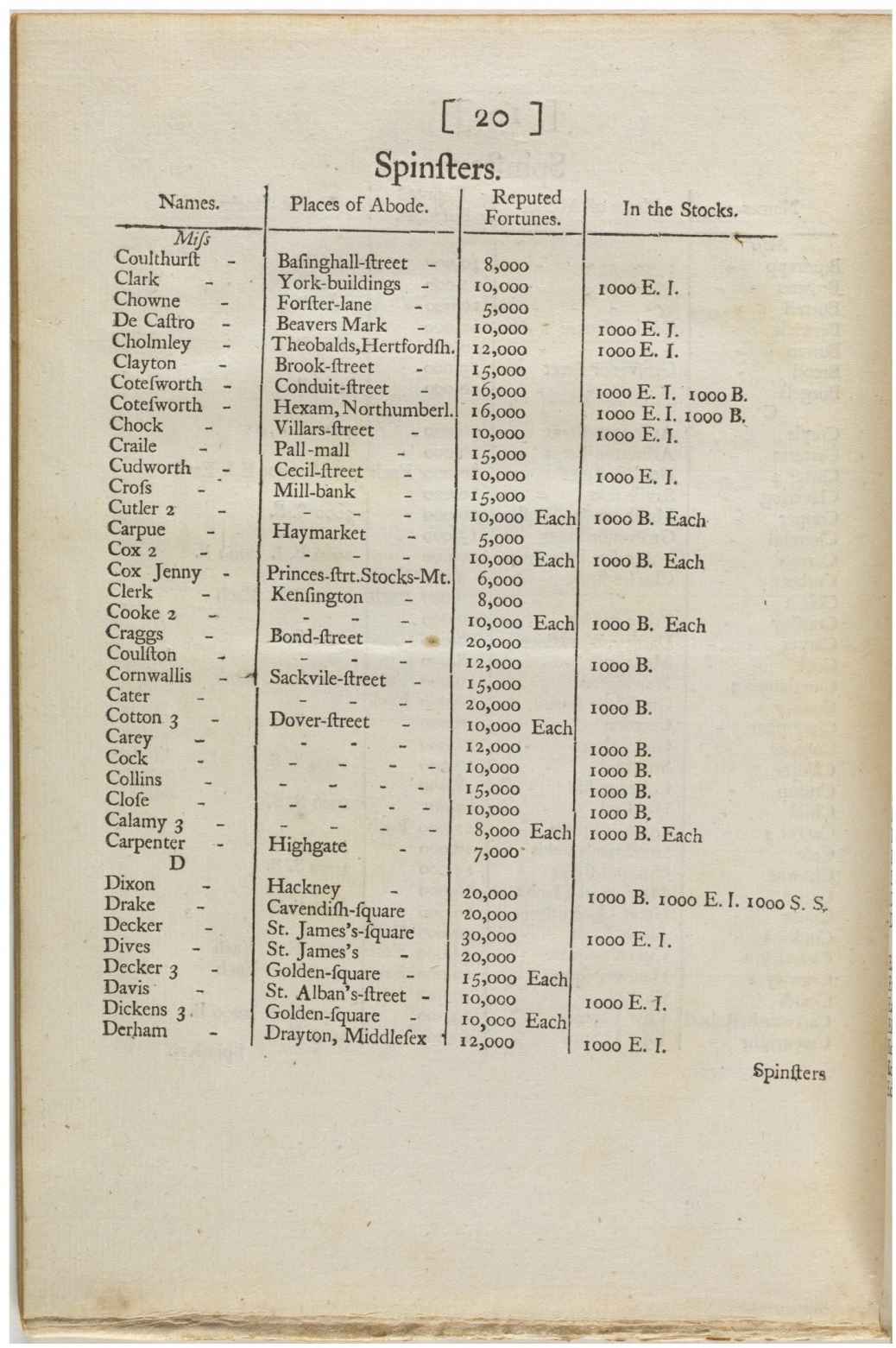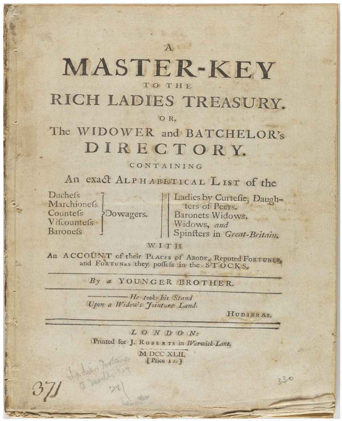 首先,这个时代符合条件的男性精英供不应求,并且上等阶级男子与有产阶级女子结合的现象大幅增加。除此之外,婚介在更广阔与更公共的场所也日益涌现。整个国家中,正如一位评论者在1732年所言,这一时期地方城镇和度假地之所以大量增加,很大程度上是因为它们可以为女士提供机会来“展示自我,寻觅良缘”。因此,争夺有钱配偶的角逐就变得愈加醒目。此一后果又因为报纸与新媒体的兴起而进一步被放大,那些媒体不仅热心报道婚姻事务,而且它们自己就变成了其进程的一部分。至18世纪40年代,富有的女性继承者的地址与联系方式如此广为人知,以至于一个野心勃勃的婚姻投机者,可以在三十二页纸上密密麻麻地印上近期一些家境优渥的单身女性的重要信息(姓名、地址、所持股票以及挂名的财产)(见插图7)。最后,毫无疑问,部分出于对于此种社会发展的回应,上层阶级一致强化了家长对于婚姻的主导,其考量即在于经济目的。17世纪晚期的一系列规章与法律之变化,削弱了妻子与孩子的财产权,而1753年的婚姻法更是极大地限制了年轻人的婚姻自由,强化了其家人之监督与同意的重要性。秘密(或“私下”)的婚姻曾在1660年之后数十年内颇为盛行,如今已被视为非法,所有婚礼都必须在夫妻的教区举行并提前公示,如果父母有一人反对,低于二十一岁的男女就不可以结婚。任何无视这一新法律的牧师将被视为重罪犯,并被判处流放美国十四年(有一两个这样的人)。