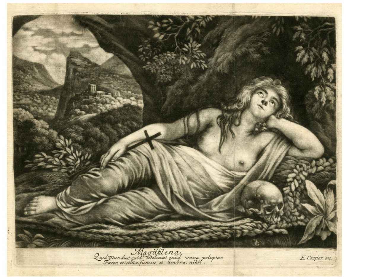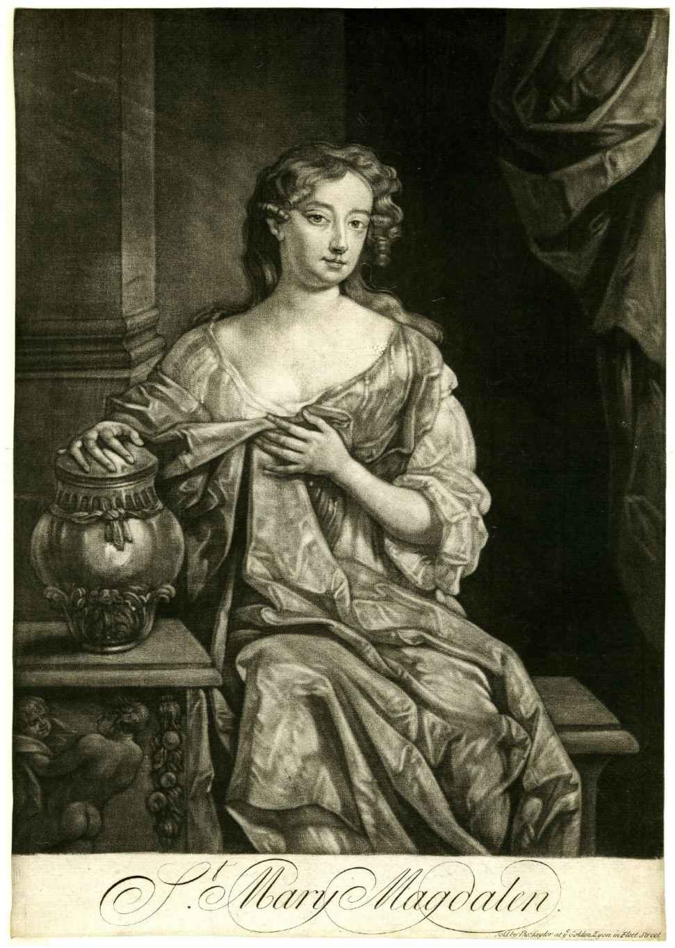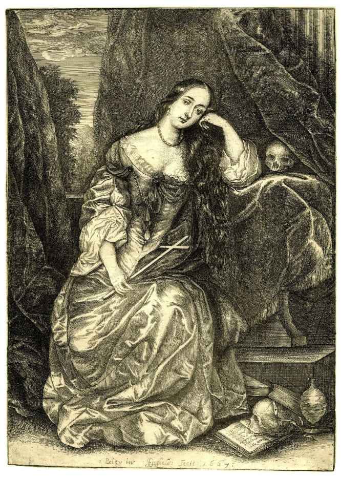 11.17世纪60年代晚期,彼得·莱利爵士画的玛丽·戴维斯,查理二世的另一个情妇,也画成抹大拉的玛丽之模样,批量销售的刻版画则是一些年后制作的。