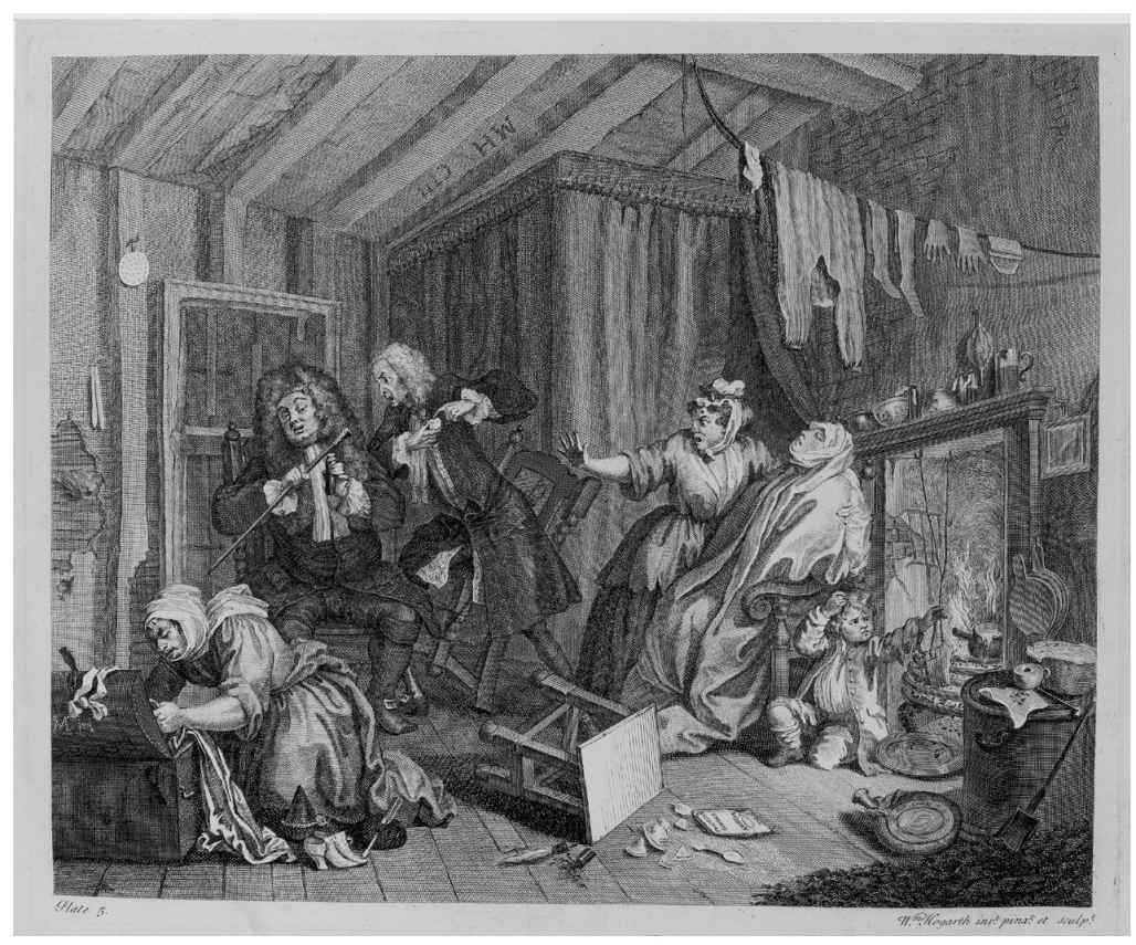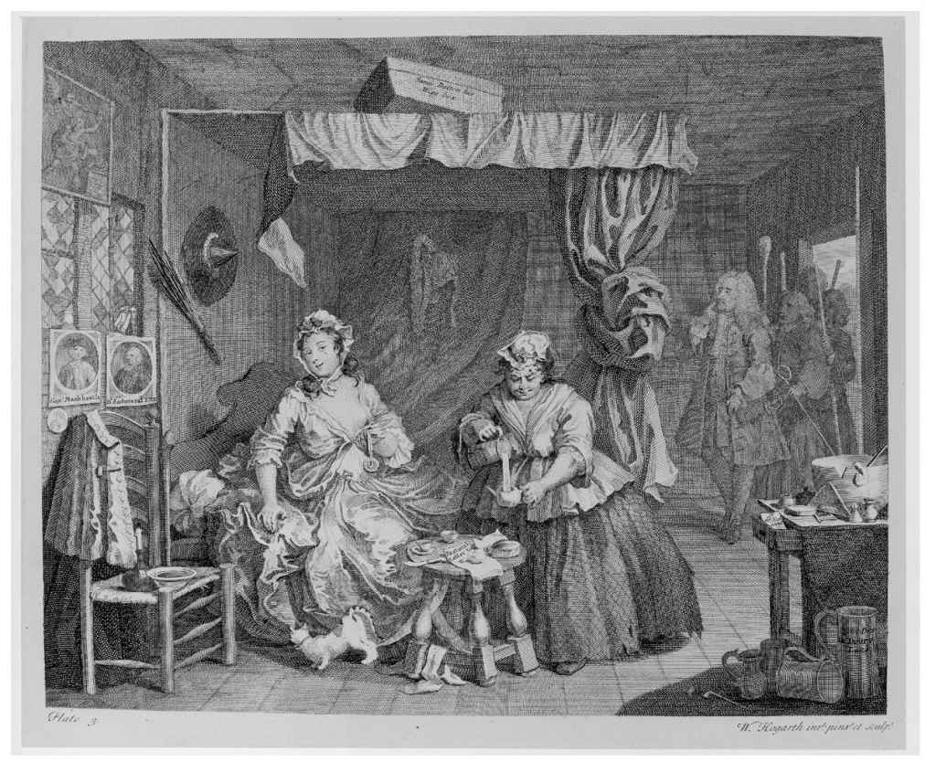 可购买这些画的人,未必将其视为次等的赝品——实际上,剽窃品往往会通过在每幅画下附上一首题诗以提供附加价值。任何口袋里有一先令或两先令的人,都可以从众多版本讲述其故事的小册子中购买一本,这些书往往会印上小尺寸的套画。此外,《一个妓女的历程》还以哑剧、歌剧、喜剧及其他戏剧的形式存在着,1732年后仍经久不衰。该套画同样在其他视觉媒介中得到完整或部分复制,在夫人的扇子上,在茶杯、浅碟及其他瓷器与锡器之上(见彩图11)。