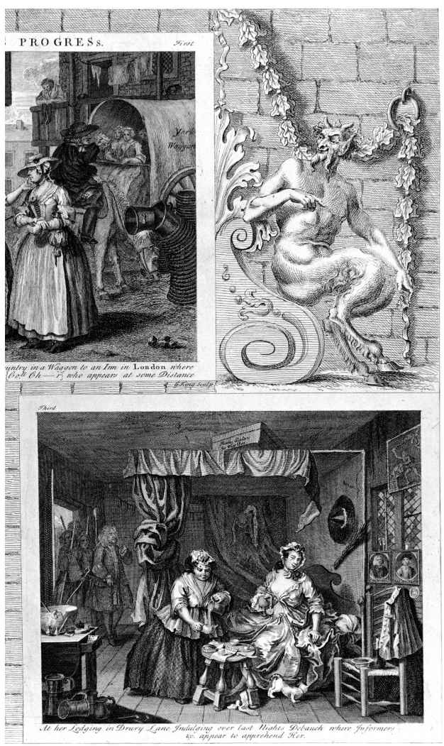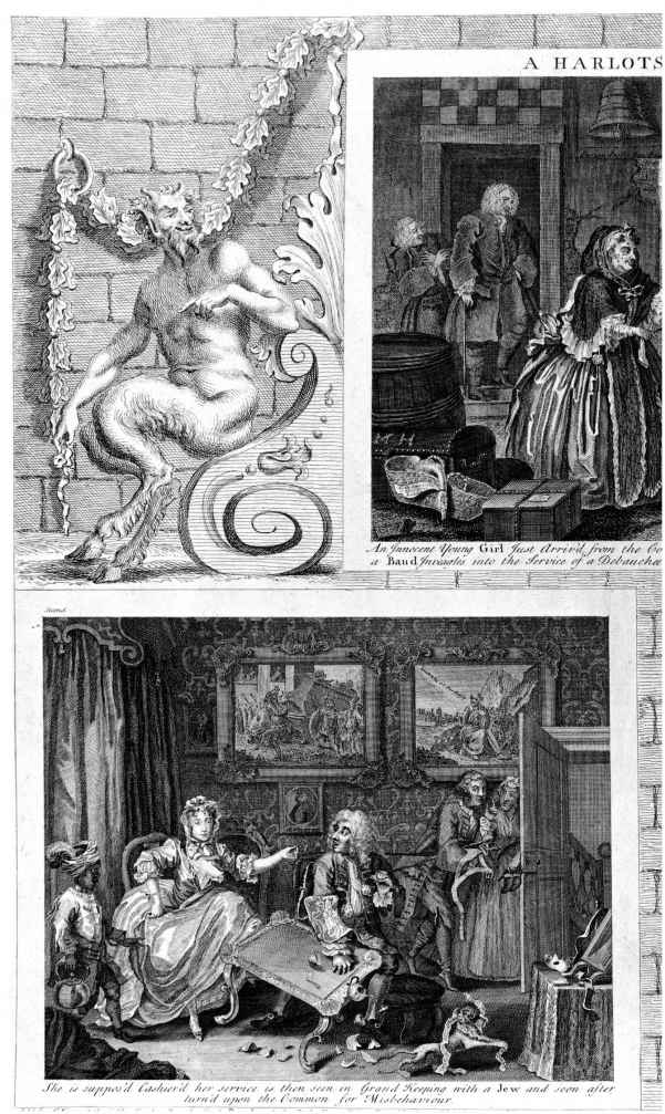 拒绝保尔森教授更极端的观点,并非意在否认荷加斯是一个极富创造力的讽刺者(当然,亦非否认我们可以在他的艺术中发现他自己未曾意识到的东西)。其画作在当时的影响,部分源自其独创性与丰富性,但还有其他两个更为关键的原因。首先,如我们在之前章节中所见,它抓住了当时的公众热点。《一个妓女的历程》之主题完全不是独创的。恰恰相反,正如霍勒斯·沃波尔所指出的,其成功应归结于“其主题之流行与技法之得当”。它将当时的热点以易于理解的视觉叙述方式展现出来:女性的受害,浪子免于追责,惩罚的无效。它还指涉了当时某些现实生活中声名最狼藉的人物:摧花大盗弗朗西斯·查特里斯上校与他的皮条客;臭名昭著的老鸨尼德汉姆夫人;响马詹姆斯·道尔顿;《乞丐的歌剧》的主角麦希斯上尉;狂热的治安法官约翰·甘森爵士;以及妓女凯特·海克保特,荷加斯以她的名字为其创造的妓女命名。在接下来的数十年间,荷加斯的画作仍然持续风行,这与人们越来越着迷于诱奸与卖淫故事的趋势互为因果。