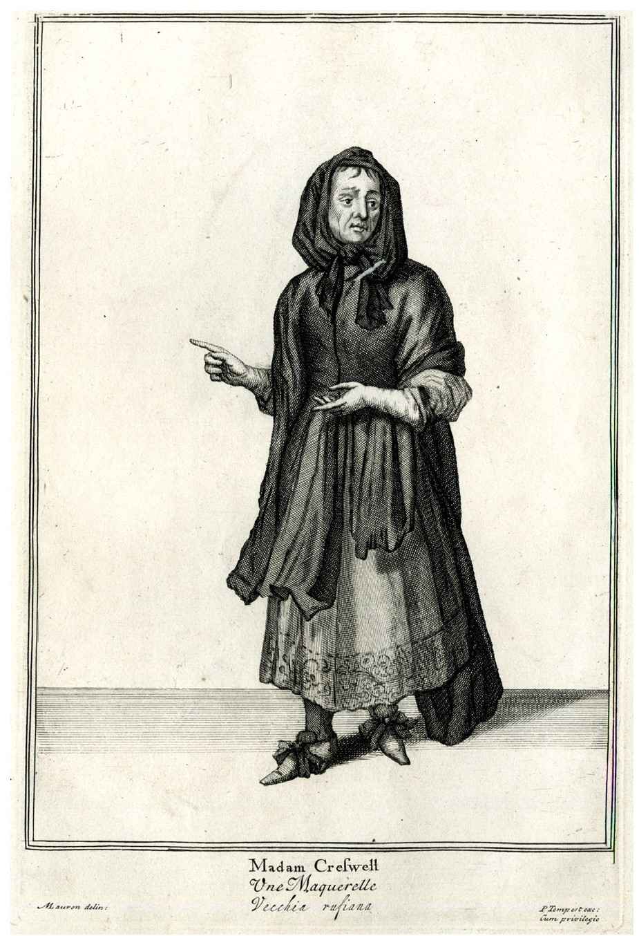 不过在这些例子中,人们的兴趣都是偶然的,态度也是敌对的。只有到了王政复辟时期,声名狼藉的放荡女子才开始生前即在印刷品中被频繁提及,且措辞亦不再那么严苛。在17世纪60年代,像达默里斯·佩奇、普里西拉·弗斯林汉姆及克雷斯韦尔夫人这类老鸨的名字,不仅见诸政治批评,亦用于兜售色情文学。在17世纪70与80年代,克雷斯韦尔夫人(第一个被《牛津国家人物传记辞典》收录的老鸨)的名声之大,以至于她在戏剧、歌谣与小册子中被不时提到,并且在马塞勒斯·拉隆反复再版的《伦敦城的呼喊》(初版于1687年)中,被形容为首都的一道风景。