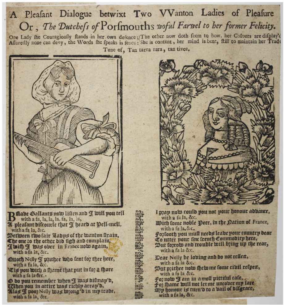 37.1685年一纸廉价的歌谣,旨在展现查理二世两位情人的样貌,朴茨茅斯公爵夫人与内尔·格温(事实上,这两幅木版画都再利用了当时已有的通用画像)。