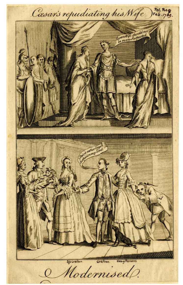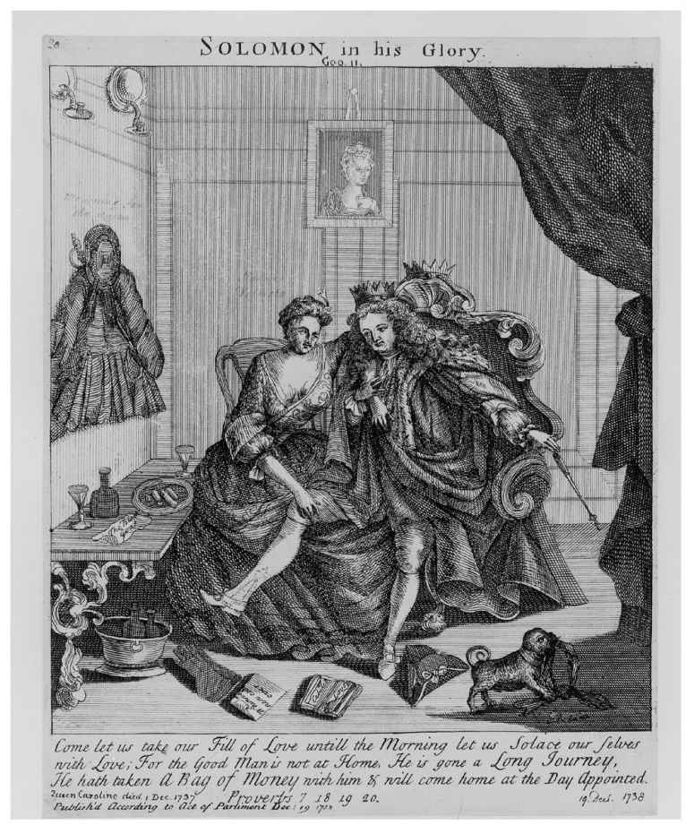 这种风尚持续到18世纪,虽然作品的基调已有所变化,从充满敬意的肖像画,逐渐转变为关于王室或贵族妓女的讽刺画。在乔治二世时代,国王自己的情妇雅茅斯夫人与王储的情妇安妮·范恩一并成为了很多喜剧表演的笑柄。在惧内的乔治三世治下,人们的目光转向了与朝中重臣——例如威尔士亲王与格拉夫顿公爵——有瓜葛的女人,格拉夫顿公爵1769年任首相后,兴起了一股印制其情妇南希·帕森斯之画像的热潮。在18世纪晚期已经形成了一种绘画的定则,即对于这种男女关系不断地肆意嘲讽(见插图39至42及彩图15)。