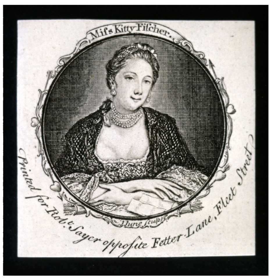 至于不那么高贵的妓女们,其画像之公开流通始于18世纪上半叶。萨莉·索尔兹伯里的某些传记已带有插图。与此同时,其大半身与半身的高品质网线铜版画,也迅速形成了一个市场(见插图43和44)。人们对于这种美术样式如此有兴趣,以至于早在1747年,就有一本印刷品收藏指南用了不小的篇幅来介绍“古代与现代女性的肖像画,这些人或者品行不端,或者疯狂,或是娼妓”。但直到18世纪50年代与60年代,名妓的画像才真正变得流行。在五六年间,就印制了大约十二种不同类型的万人迷基蒂·费舍尔之画像(见插图45及彩图16至18)。