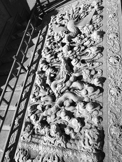 这块玲珑剔透的丹陛石是我国石雕艺术中的珍品,凤上龙下的图案设计也是慈禧野心膨胀、权势独揽的外在表现。 慈禧陵三殿的外墙磨砖对缝,干摆到顶,超越于帝陵规制。一般外墙的传统做法,是上身糙砖灰砌,抹饰红泥,提刷红浆;下肩则澄浆砖干摆。慈禧陵则全部干摆到顶,其拔檐看面雕刻“卍”字、蝙蝠、流云,称“万福流云”。