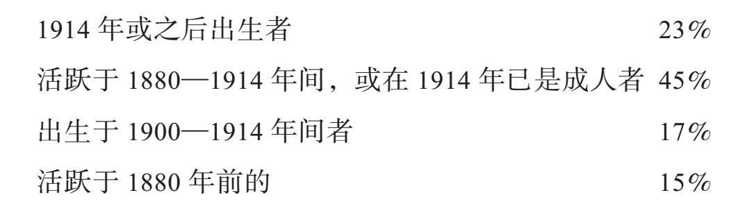 比方说,让我们来看一看对20世纪最具影响力的政治人物名单:1914年时,列宁[Vladimir Ilyich Ulyanov(Lenin)]44岁,斯大林[Joseph Vissarionovich Dzhugashvili(Stalin)]35岁,小罗斯福总统(Franklin Delano Roosevelt)30岁,凯恩斯(J. Maynard Keynes)32岁,希特勒(Adolf Hitler)25岁,阿登纳(Konrad Adenauer,1945年后德意志联邦共和国的缔造者)38岁,丘吉尔(Winston Churchill)40岁,甘地(Mahatma Gandhi)45岁,尼赫鲁(Jawaharlal Nehru)25岁,毛泽东21岁,胡志明、铁托[Josip Broz(Tito)]与佛朗哥(Francisco Franco Bahamonde)均为22岁,也就是比戴高乐(Charles de Gaulle)小两岁,比墨索里尼(Benito Mussolini)小9岁。再看一看文化领域内的重要人物。比如根据1977年出版的《现代思想辞典》(Dictionary of Modern Thought )所收录的文化人物为抽样标本,其结果如下: