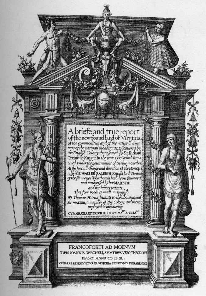 哈里奥特强调,弗吉尼亚非但不是凄惨之地,反而是自然资源丰饶之地,对商人与移民来说都颇为合适。他以奢侈品为例展开论述,指出弗吉尼亚的蚕“和我们这里的普通胡桃一样大”,只需种下桑树,就可以发展产值高、利润也高的蚕桑业。发展正是哈里奥特的核心论点:那里的物产丰饶,不管是木材、矿石、皮毛、水果还是粮食作物,都只需英国人去稍事简单劳作即可获得,相当经济可行。哈里奥特的这番论证对于英国人来说不仅有着利润上的诱惑,也为他们日后篡夺那些土著民族的土地提供了辩护依据。哈里奥特又将话题转向弗吉尼亚的当地居民,指出“与我们相比,他们是一个可怜的种族,因为缺乏技术和判断力,对我们所拥有的东西不了解,也不会使用,明明眼前有更具价值的东西,却只看重那些在我们眼中微不足道的东西”。尽管如此,哈里奥特也认为他们“非常心灵手巧,尽管没有工具,也没有像我们一样掌握工艺、科学和艺术,但在他们自己从事的事情上仍然展现出了卓越才智”。他认为,向当地居民指出他们非英式生活方式的错误不会太难,一旦他们明白“我们掌握的知识与工艺、处理事情的速度都远远超过他们”,“他们就愈发可能想要得到我们的友谊与爱,更尊重我们,愿意取悦、服从我们”。[5]简言之,在文化和宗教上让当地土著遵从欧洲的社会规范,似乎确有可能。