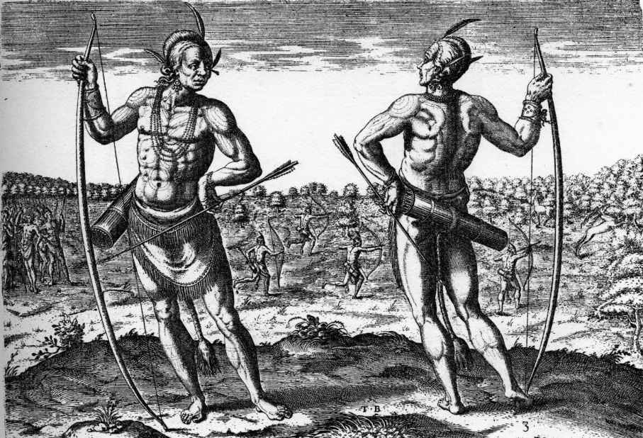 图5 《一名弗吉尼亚部落首领》。托马斯·哈里奥特《关于弗吉尼亚新大陆的真实简报》(1590年)书中第41页:“弗吉尼亚部落首领的打扮如图中所示。他们将长发编成辫子束在耳下……”纽卡斯尔大学特藏。