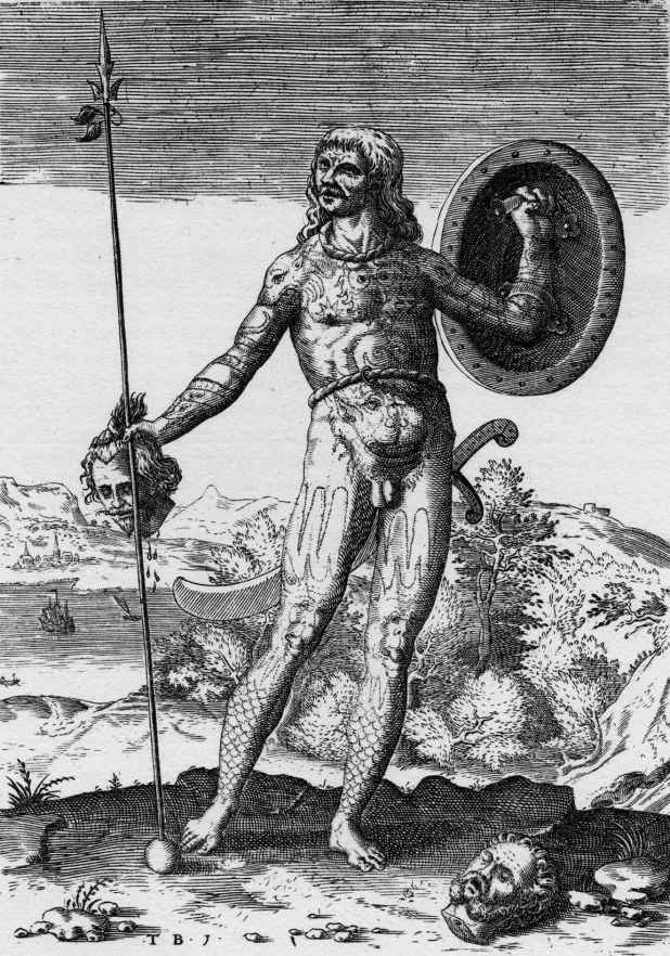 图6 皮克特人,托马斯·哈里奥特《关于弗吉尼亚新大陆的真实简报》(1590年)第68—69页:“皮克特人是大不列颠英格兰地区从前的本土居民,他们穿着兽皮,如图中所示在身上绘满图案。他们的头发齐肩,露出额头。”纽卡斯尔大学特藏。