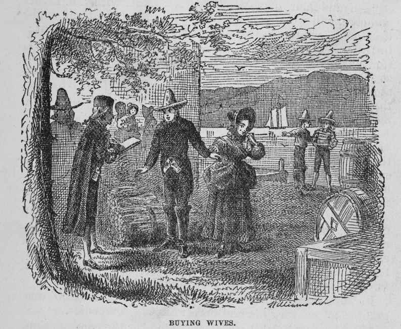 图8 《购买妻子》(摘自E.R.比林斯:《烟草:历史、种类、文化、生产和商业》,1875年)。在这幅图片中,来自英国的妇女很可能是乘坐那艘停泊在她身后码头上的船抵达的。在她身旁站着一位想要购买她的人/她未来的丈夫。另一侧放着几只装满烟草的木桶,用以支付她来弗吉尼亚的船票。这幅图片将这些元素并置在一起,强调了这笔交易的商业本质。伦敦韦尔科姆图书馆特藏。