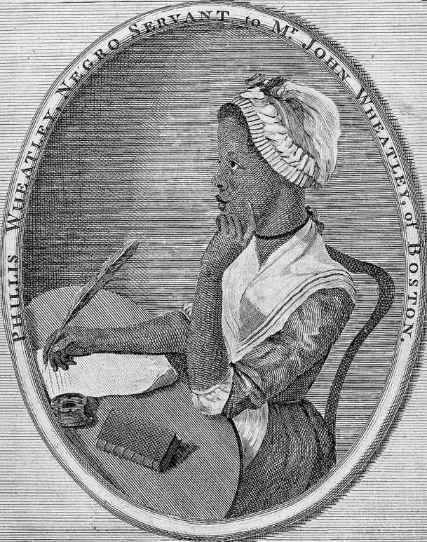不论杰斐逊怀有何种信念或期望,在独立革命爆发前的几十年中,许多美国人从来就没有想过废除奴隶制。18世纪末期,美国和英国对于非白人文化都持蔑视的态度,事实上,他们认为,除了白人之外的任何人种的文化都没有资格被称为文化。这方面一个很好的例子就是美国第一位黑人女诗人菲利斯·惠特利(Phillis Wheatley)在最初出版诗集时遭到的质疑(图16)。惠特利年幼时就被卖到美国成为奴隶,在主人家,也就是波士顿的惠特利家族中长大。1773年,她出版了一本名为《宗教与道德诗歌集》(Poems on Various Subjects, Religious and Moral)的诗集。不过,在这本诗集的前言中,不得不找来很多波士顿当时的显要白人男性,包括后来马萨诸塞州总督的托马斯·哈钦森(Thomas Hutchinson)等人,向那些持怀疑态度的读者保证,他们面前的这本诗集的确是“出自菲利斯这样一个年轻的黑人女孩之手,她刚刚从非洲被卖到这里不过几年的时间,在此之前,她只是一个未经开化的野蛮人”。这些人在前言里通情达理地承认,菲利斯自从来到殖民地后,一直都“在镇上一户人家家中为奴”。正是由于菲利斯是奴隶身份,她的才智和文学才能就必须要靠那些白人男性来证实,性别和肤色让这些白人男性获得了毋庸置疑的可信度,也让菲利斯自己失去了话语权。[6]