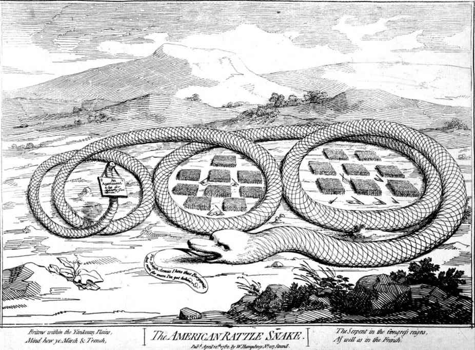 图20 詹姆斯·吉尔雷《美国响尾蛇》(伦敦:W.汉弗莱,1782年4月)。殖民地经常会以蛇作为象征;在星条旗出现之前,美国国旗上也有蛇的图案。之前的漫画,尤其是1754年的一幅漫画,把殖民地描绘成一条被割断的蛇,暗示他们“要么团结,要么死亡”。这幅漫画出现在巴黎和会召开之时,它描绘了一条完整的蛇。这条蛇的舌头上得意地写着,“我的身体已经‘伯戈因’了两支英国军队(这句话将“伯戈因”作为动词使用,意为围困。这种用法旨在讽刺伯戈因在交战中屡次惨败。——译者注)/我还为更多的军队留足了地方”。这条蛇的身体卷成三个圈,其中两个圈所包围之地分别象征着伯戈因和华康里的军队。第三个圈则宣称是“为其余的军队准备的”。下面的诗句说的是“在北方平原上的英国人/想想你们该如何行军前进、如何挖掘战壕/这条巨蟒在议会呼风唤雨/在法国也是一样”。由美国国会图书馆印刷品与照片部友情提供(LC-USZ62-1531)。