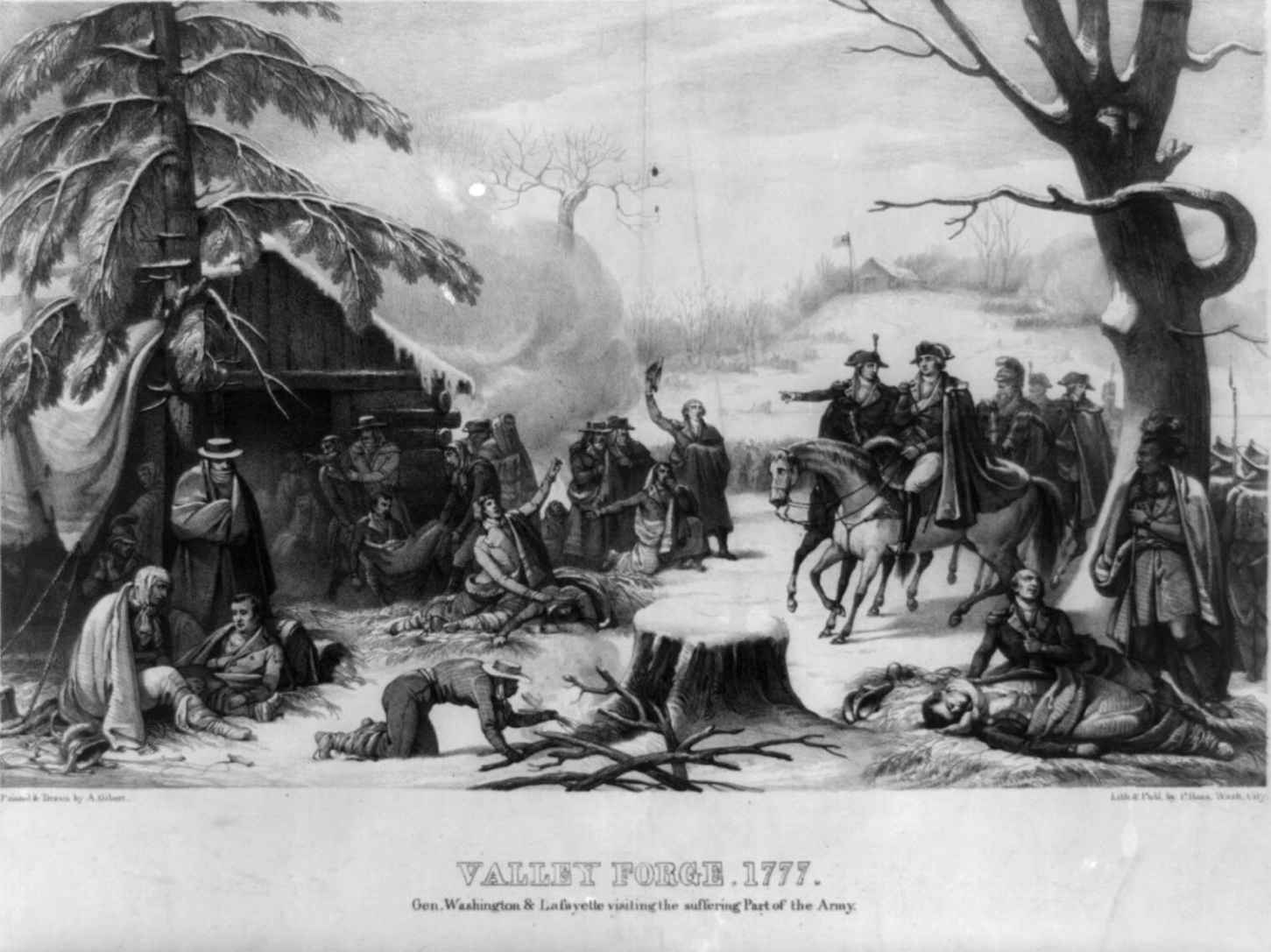 图19 《瓦利福奇1777》。华盛顿将军和拉斐德侯爵看望受伤士兵。拉斐德是一位辅佐华盛顿的法国军队指挥官。他在军队从布兰迪万战役中撤退时起到了重要作用,之后又通过谈判成功让法国加入到这场战争中,与美国人并肩作战。此后他返回美国,在约克敦击败了康华里。此画由A.吉贝尔创作、P.哈斯印刷出版。由美国国会图书馆印刷品与照片部友情提供(LC-USZ62-819)。