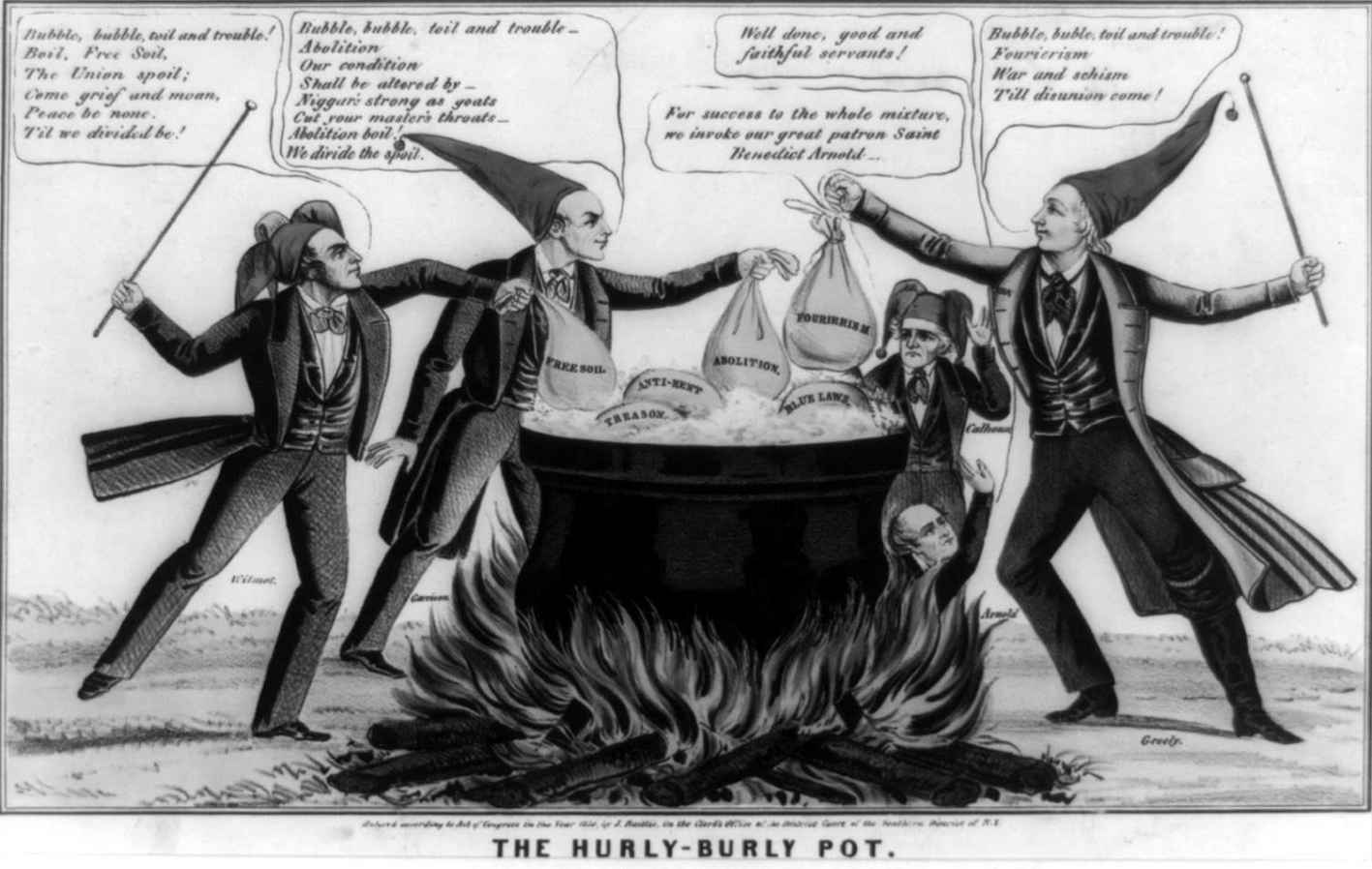 图27 《喧嚣的锅》(纽约,詹姆斯·巴耶,1850年)。这幅1850年的政治讽刺漫画表现了废奴主义者、自由之土和地方利益是联邦面临的危险。画中的代表人物包括,从左起:自由之土党人政客大卫·威尔莫特(他于1846年提议在从墨西哥战争中获得的土地上全面禁止奴隶制,虽然众议院两次通过了“威尔莫特但书”,但每次都被参议院否决。尽管如此,这一事件还是促使那些地区对于奴隶制问题的看法两极分化),倡导废奴主义的编辑威廉·劳埃德·加里森,约翰·卡尔霍恩,以及《纽约论坛报》的激进编辑霍勒斯·格里利。火中的人是臭名昭著的革命叛徒贝内迪克特·阿诺德。除阿诺德之外的其他人都穿着小丑服或戴着滑稽帽,而三位主要人物(加里森、威尔莫特和格里利)代表着《麦克白》里的巫婆,正往大锅里添加各种社会、政治之恶:“自由之土”、“废奴运动”和“傅立叶主义”(格里利是乌托邦社会家夏尔·傅立叶的著名支持者)被加到锅里已有的“叛国”、“抗租”和“蓝法”(安息日对某些活动,尤其是商业活动的限制,通常与清教徒有关)中。威尔莫特的对话框里写道:“泡沫,泡沫,麻烦与劳作!/沸腾吧,自由之土,/将联邦破坏;/来吧悲伤与抱怨,/和平将无存。/直到我们分离。”加里森说的是:“泡沫,泡沫,麻烦与劳作!/废奴主义/我们的条件/将被改变/黑人壮如山羊/割开你主人的咽喉/废奴主义在沸腾!/我们分头破坏。”格里利说的是:“泡沫,泡沫,麻烦与劳作!/傅立叶主义/战争和分裂/直到联邦解体!”微型的卡尔霍恩宣布着“为了整锅大杂烩的成功,我们唤来了伟大爱国者圣贝内迪克特·阿诺德。”阿诺德则补充道:“干得好,善良而忠贞的仆人们!”由美国国会图书馆印刷品与照片部友情提供(LC-USZ62-11138)。