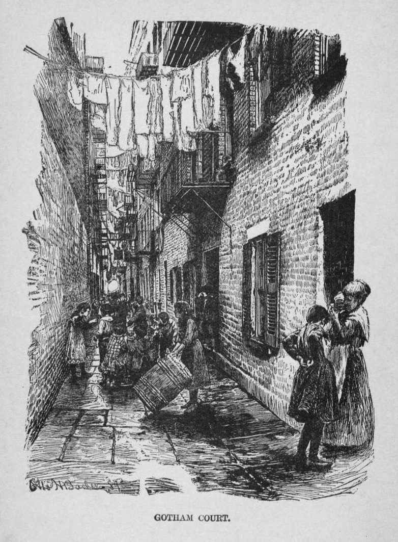 图39 《戈瑟姆法院》。这幅插图出现在雅各布·里斯1889年在出书前所写的一篇文章《另一半怎么生活:租户研究》,载于《斯克里布纳杂志》第6卷第6期(1889年12月)。在这篇文章以及后来的书中,里斯强调,纽约——也暗指整个国家——已经“错失了可以健康发展的良机,并且这个机遇失不再来”。在某种程度上,里斯也是一种阶级批判,批判纽约沿着中心区曼哈顿岛的逐渐扩张。在此过程中,个体被带离了最初的落脚点和身为贫困移民的初始状态,被无情地驱赶着向上攀爬,向财富和成功进发。作为成为美国人的一种隐喻,这种持续的城市更新和向上的流动性难以阻挡,然而正如里斯强调的那样,对于许多人来说,这又太难实现。“在闹市区的那些老房子里,”他指出,“租户由于无知而出生,在贪婪中被抚养成人……从列车呼啸而过的高架铁路出发走上几十步,穿过布鲁克林大桥底下的富兰克林广场,列车喧嚣的回音还在耳边作响,但你已经从繁荣地带来到了贫困地带。”(第643页)