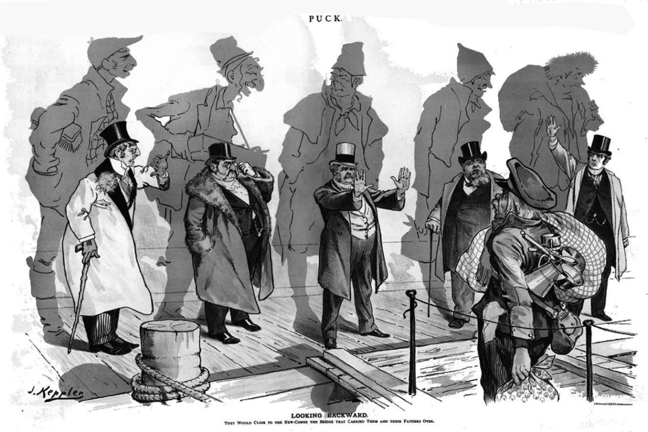 拉维基口中的“旧世界的灵魂”花了一段时间才适应了这个新环境和这里的居民,他们被许多本地居民看作是些“可笑的人”,甚至还会被称作“欧洲的渣滓”。拉维基来到美国时,美国的移民法已经开始收紧,1882年颁布了第一部《联邦移民法》,将罪犯、疯子、贫民以及那些有可能成为公众负担的人群排除在外。同年,《排华法案》通过,这部法案最初是为了阻止西方进口廉价中国劳工,后来却不仅成为移民管制的参考模板,而且随着美国影响力范围——或者至少是活动范围——向海外的扩张,扩展到了更广泛的种族态度问题上。当然,美国已经在更近的局部地区尝试并且测试过了移民管制的程序。自由女神像揭幕还没到10年(1897年),移民限制联合会就提出,和那些南方想参与投票的非裔美国人一样,新移民在移民前必须参加识字测验。
