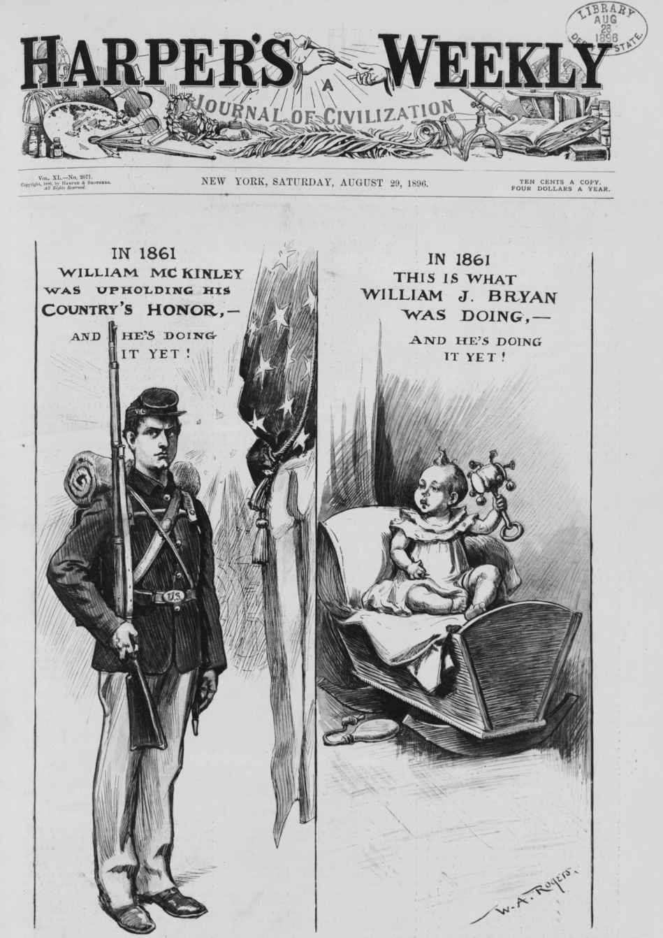 实际上,1896年的总统选举在很多方面都唤起了内战的回忆,一些之前在联邦军队中最具影响力的人物,包括参加过葛底斯堡战役的丹·西克尔斯(Dan Sickles),以及后来领导过自由民局的奥利弗·奥蒂斯·霍华德(Oliver Otis Howard),都是麦金利的支持者。西克尔斯和霍华德都是伤残退伍军人(前者在1863年葛底斯堡战役中失去了一条腿,后者则在前一年的半岛会战中失去了一只胳膊),他们有力地提醒了人们去关注一些至关重要的问题。在1893年美国经济衰落的背景下,麦金利的竞选阵营唤起了人们对于美国在内战冲突中那些艰难境况的回忆,并强调美国的经济稳定乃至社会稳定都要依靠“健全的货币政策”(sound money)。他们辩称只有美国保持商业导向的金本位制,这一目标才可以达成。相反,布赖恩的竞选阵营则提倡采纳银本位制。自从美国于1859年在内达华州发现了“卡姆斯托克矿脉”之后,美国的银产量便十分丰富了。他们认为银本位制将会增加货币供应,同时减轻联邦和邦联双方内战遗孤、退伍军人等群体的经济压力。在总统选举的过程中,这些人经常会成为很多政治漫画的主人公。