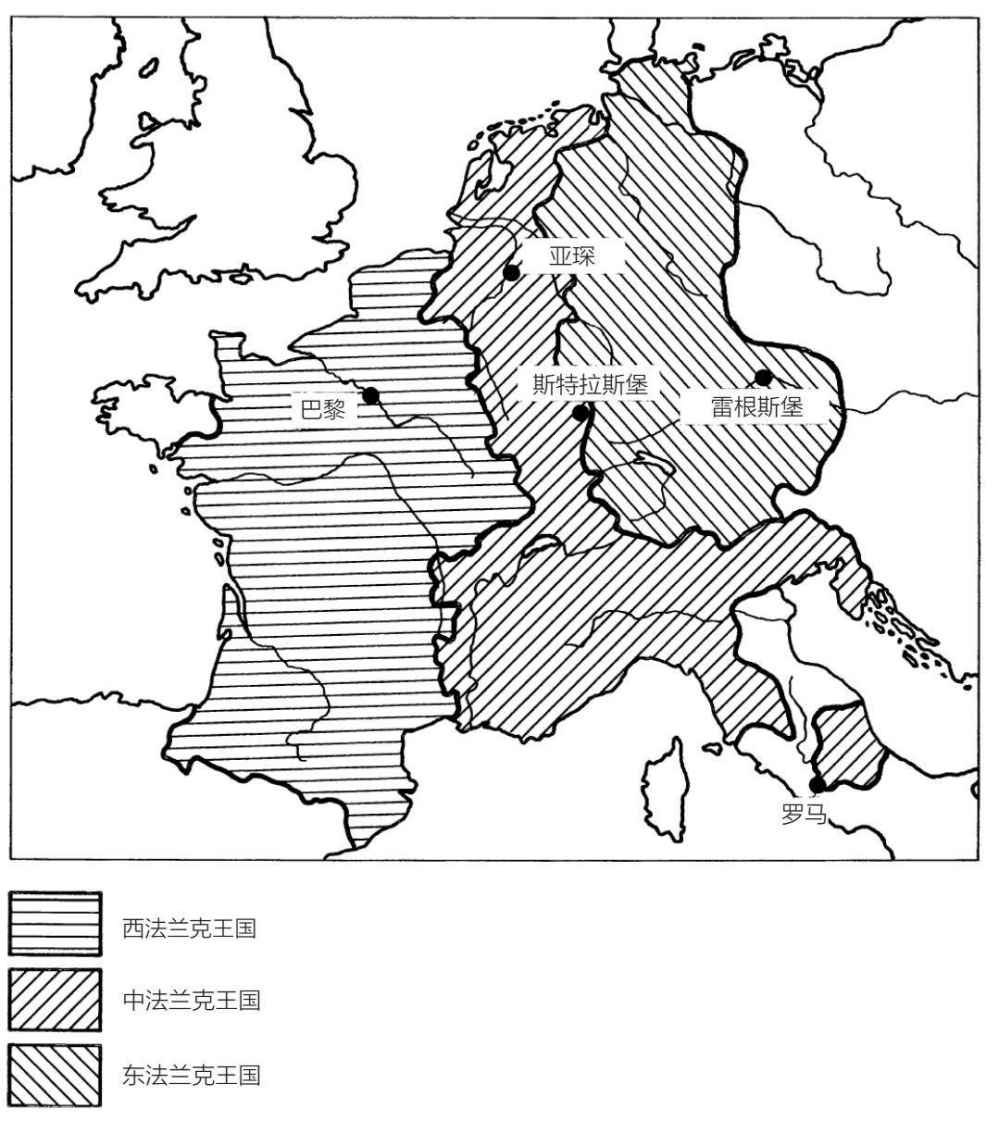 地图2.1 根据843年《凡尔登条约》分割的查理曼帝国