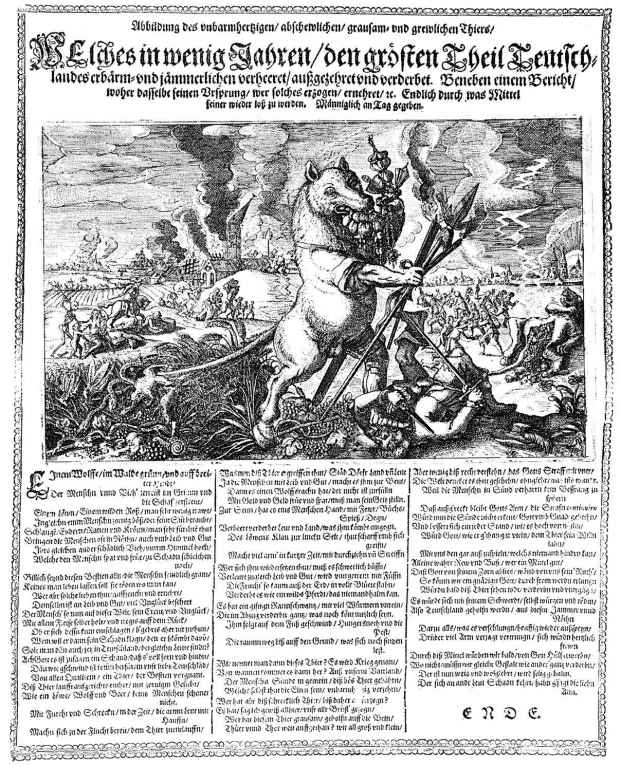 图10 战争遭到广泛批评,例如将战争描绘成一头毁坏德国的猛兽。沃尔芬比特尔的奥古斯特大公图书馆传单收藏室藏。