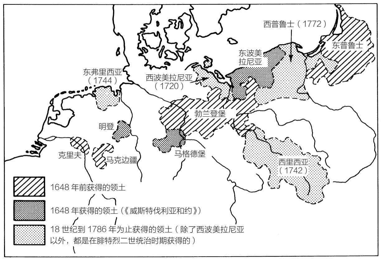 地图5.1 1786年为止扩张后的勃兰登堡-普鲁士(但泽在1793年才并入普鲁士)
