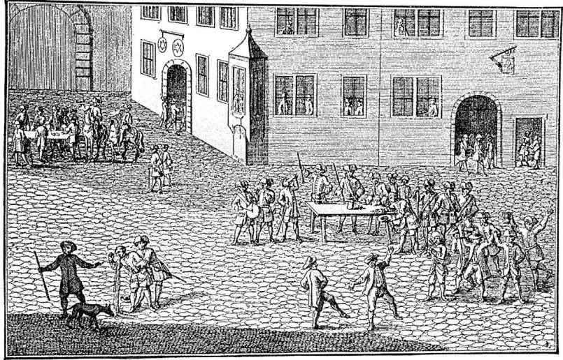 图15 18世纪早期的征兵。出处:H. J. von Fleming, Der Vollkommene Teutsche Soldat(Leipzig, 1726), 翻印:Weltgeschichte(Berlin: Ullstein, 1907—1909)。