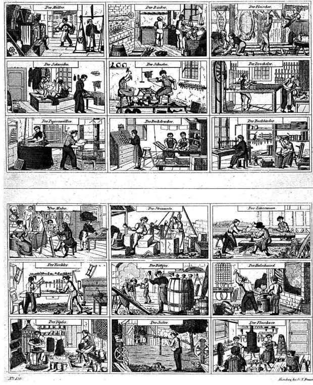 图21 18世纪至19世纪早期的多种职业。纽伦堡日耳曼国家博物馆铜版画陈列室藏。