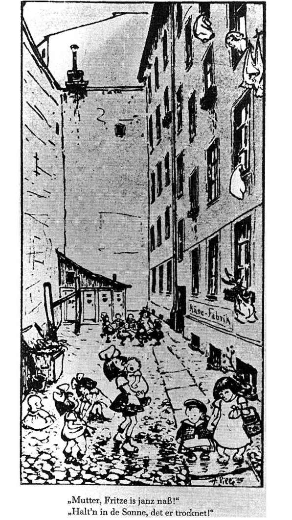 图23 柏林艺术家海因里希·齐勒(Heinrich Zille)所作的描绘工人阶级生活的漫画。配文为:“妈妈,弗里茨浑身湿透了!”“那就把他举在太阳下,他会干的!”
