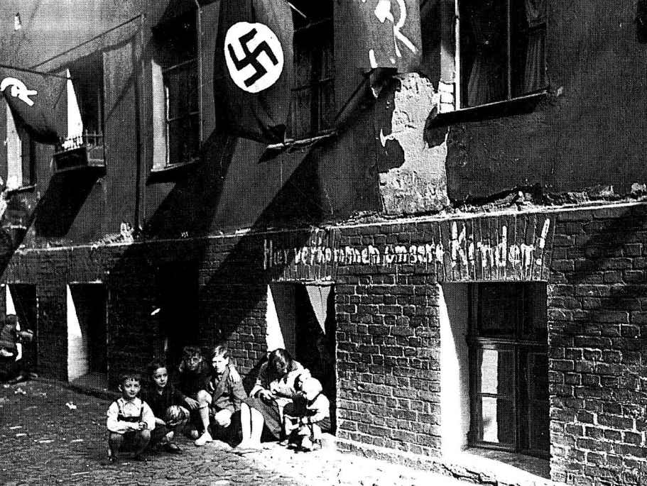 图29 1932年柏林拒付租金运动。院子里,共产党和纳粹党的旗子并排悬挂。柏林州立档案馆州立图片资料室藏。
